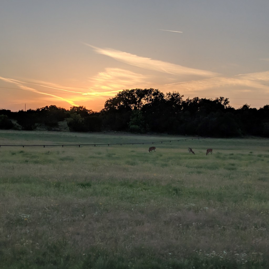 The sky has taken on shades of pink and peach as the sun peeks over the eastern horizon. The moon still hangs heavily in the west. Barely a breeze rustles in the live oak trees and tall grasses; the lake is still and smooth as glass. There is a slight chill in the air and the coffee I sip helps keep me warm. Deer graze in the field across the winding road.
