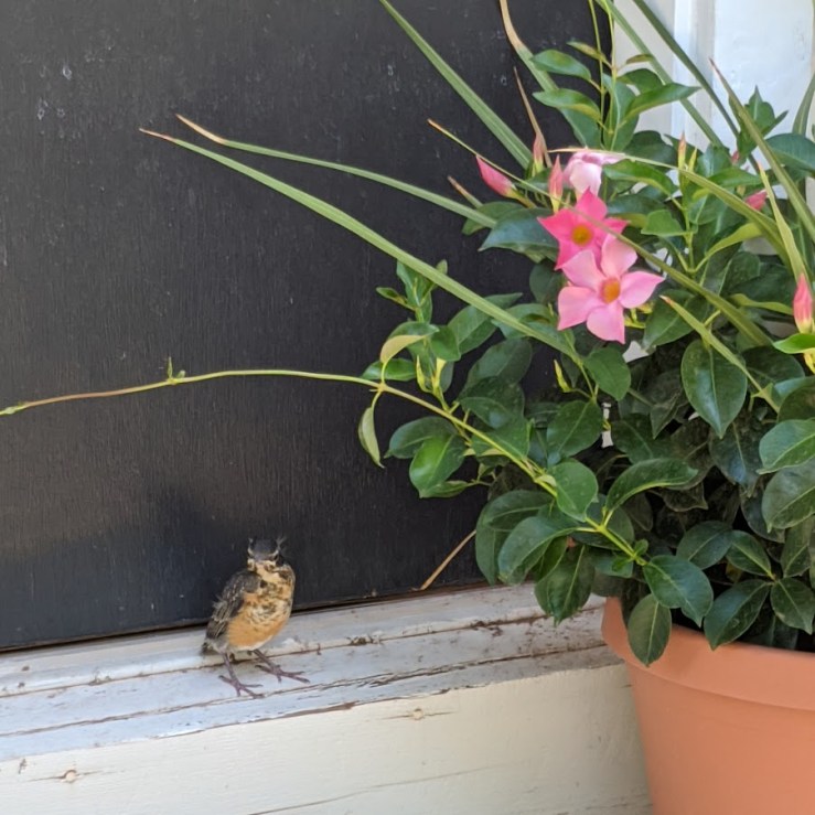 This little bird was nestled against the door on my side porch. Even my quiet approach did not cause him to leave this shady, nearly concealed spot beside a pot of blooming flowers. He cocked his head my direction and just calmly watched as I crouched down and snapped his image. I’m sure he thought I was nuts.