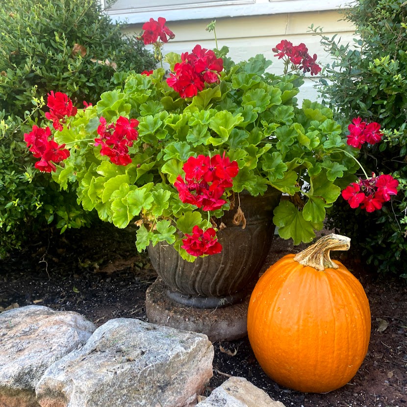 There are leftover blooms that survived the Summer heat and make a showing right up until the first freeze. This red bloomed geranium is still going strong and lends another pop of color to Fall’s display.