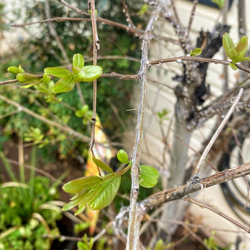 We took advantage of the softer ground after the rain to pull some weeds and clean up the flower bed along the front of the house. Our poor crepe myrtle had been so damaged by the heat ~ it really appeared to have died, despite our watering it regularly. But, here it is sporting new growth and I am so thankful it isn’t dead! I wonder if it will go full cycle and get to bloom again before the first freeze? Only time will tell ~ I have never seen it do this before and don’t quite know what to expect.