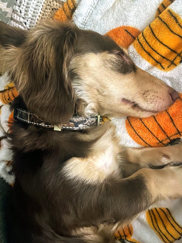 We are still working with house training and he has his “feral” moments when he just forgets and squats in the midst of play. But, overall, we’re getting there! Unfortunately, he has had a bit of the runny poops the last couple of days, which has set us back a bit. Here’s to hoping that whatever he ingested ~ and it could be ANYTHING since he puts EVERYTHING in his mouth ~ clears his system soon and we can get back on track. He is my little sidekick and I don’t even remember what it was like when I got to sleep past 5:30 AM….